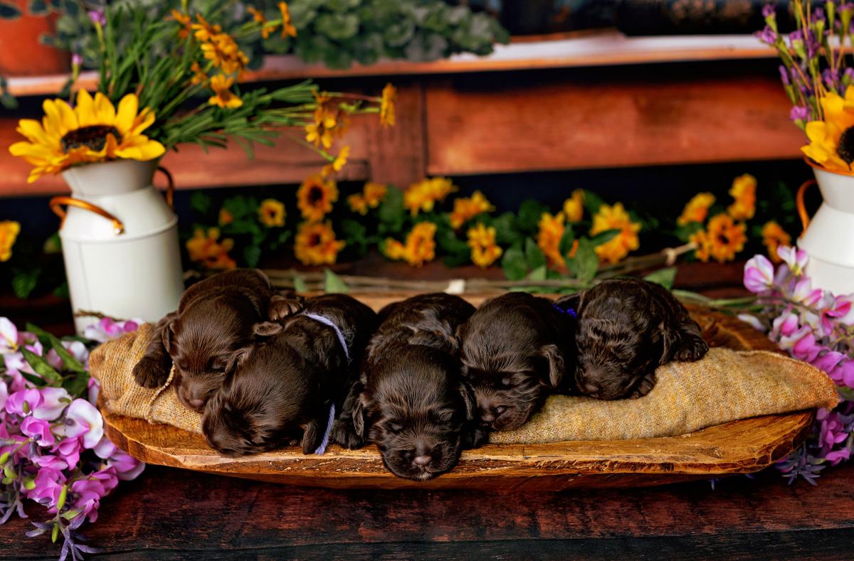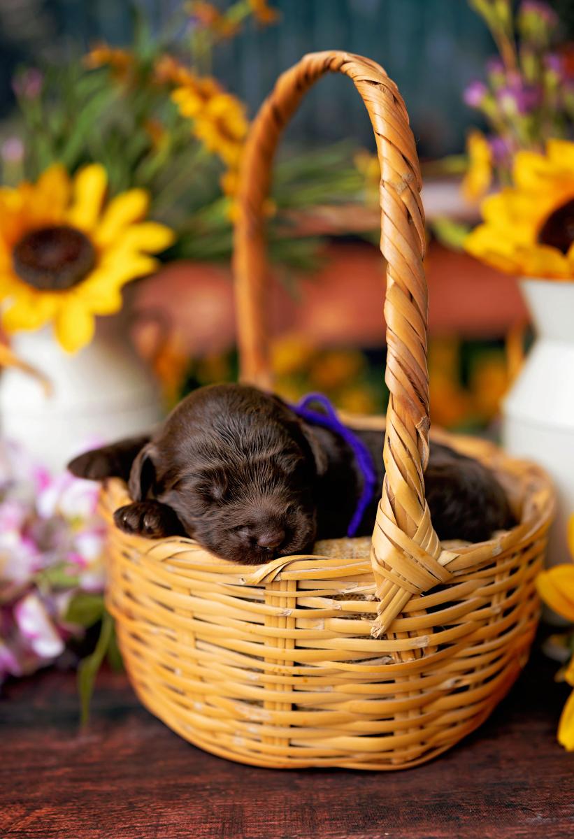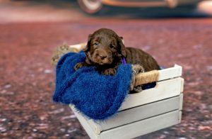 Our sweet Abby is the firstborn girl and the second-largest in the litter. Her silky parchment wavy fleece coat shines in the sun, and her personality is just as bright. Abby is confident, athletic, and incredibly affectionate. She loves to explore but equally loves curling up close, making her a beautiful balance of playful and calm. She’s a wonderful prospect for an active family or service/therapy work.
