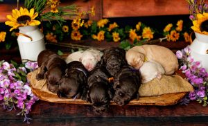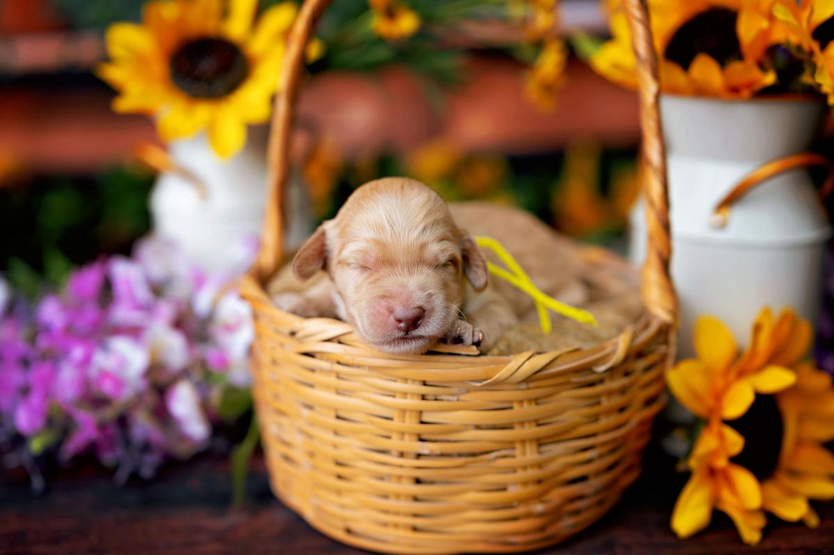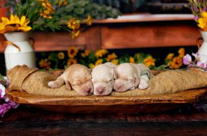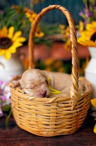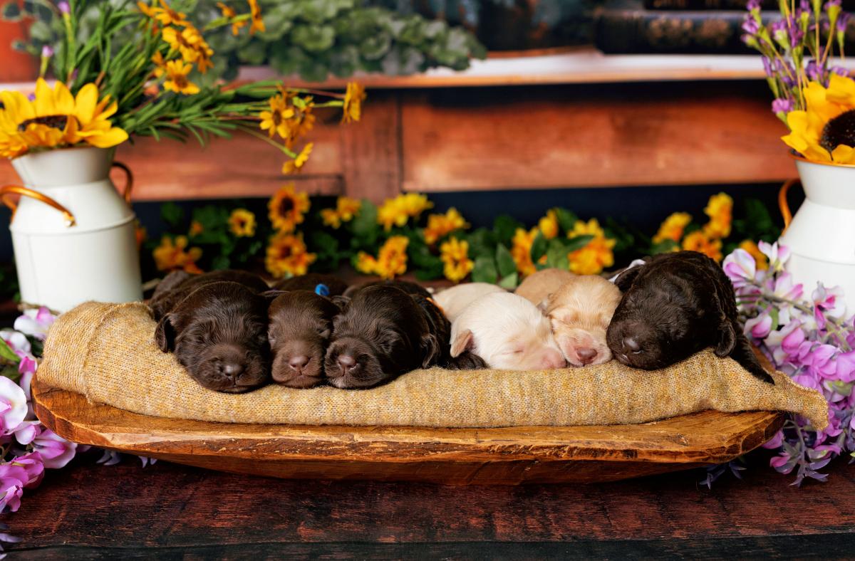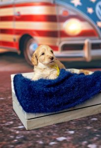 Mitzi, our 3rd-born girl, wears a beautiful warm caramel wavy fleece coat and carries herself with a happy, sunny energy. Middle-of-the-litter in size, she’s athletic, adventurous, and always ready for a game — yet when playtime is over, she melts right into your arms. Her combination of fun-loving spirit and calm attentiveness makes her ideal for service or therapy training.